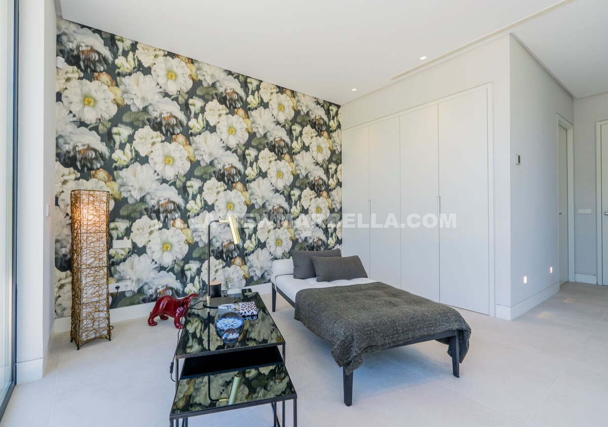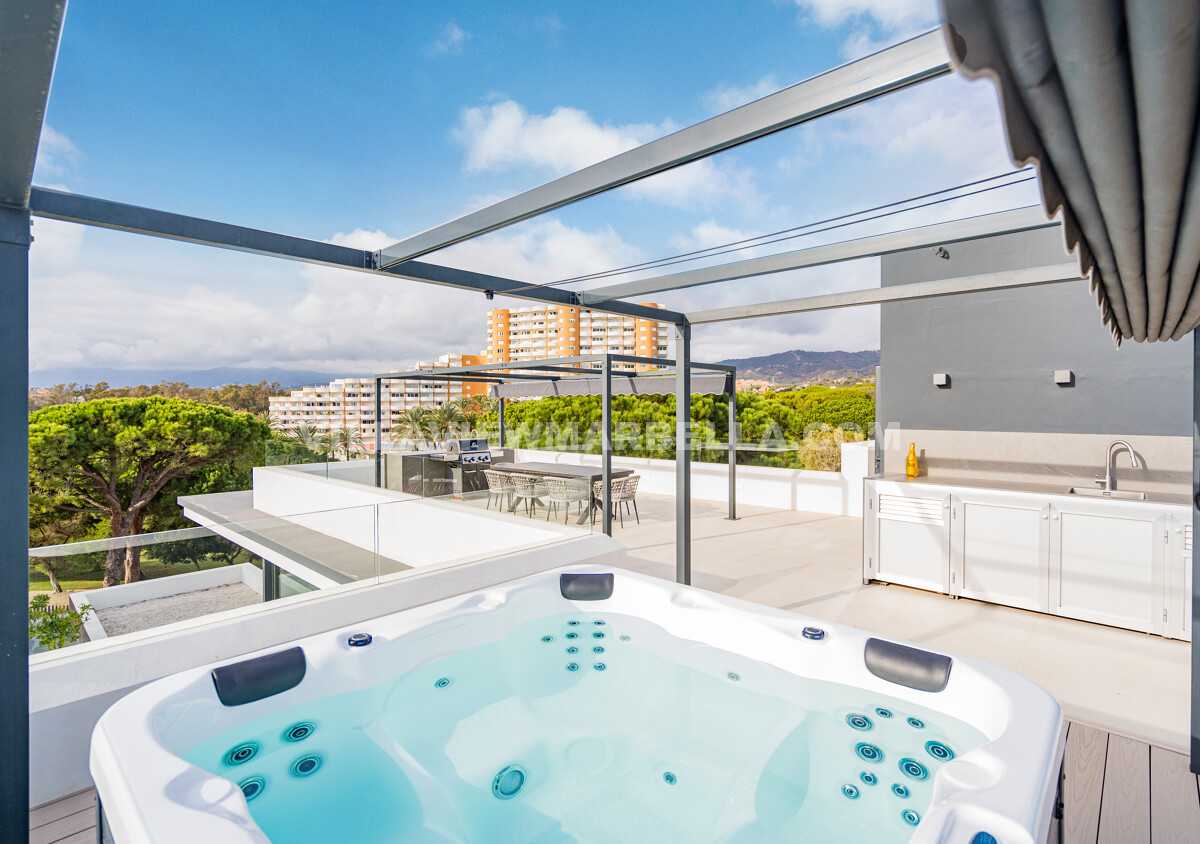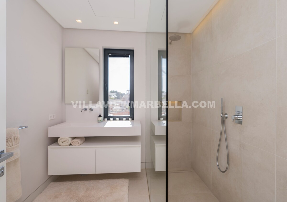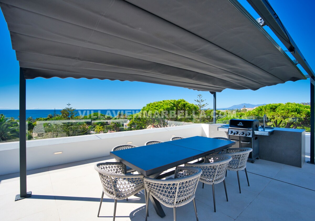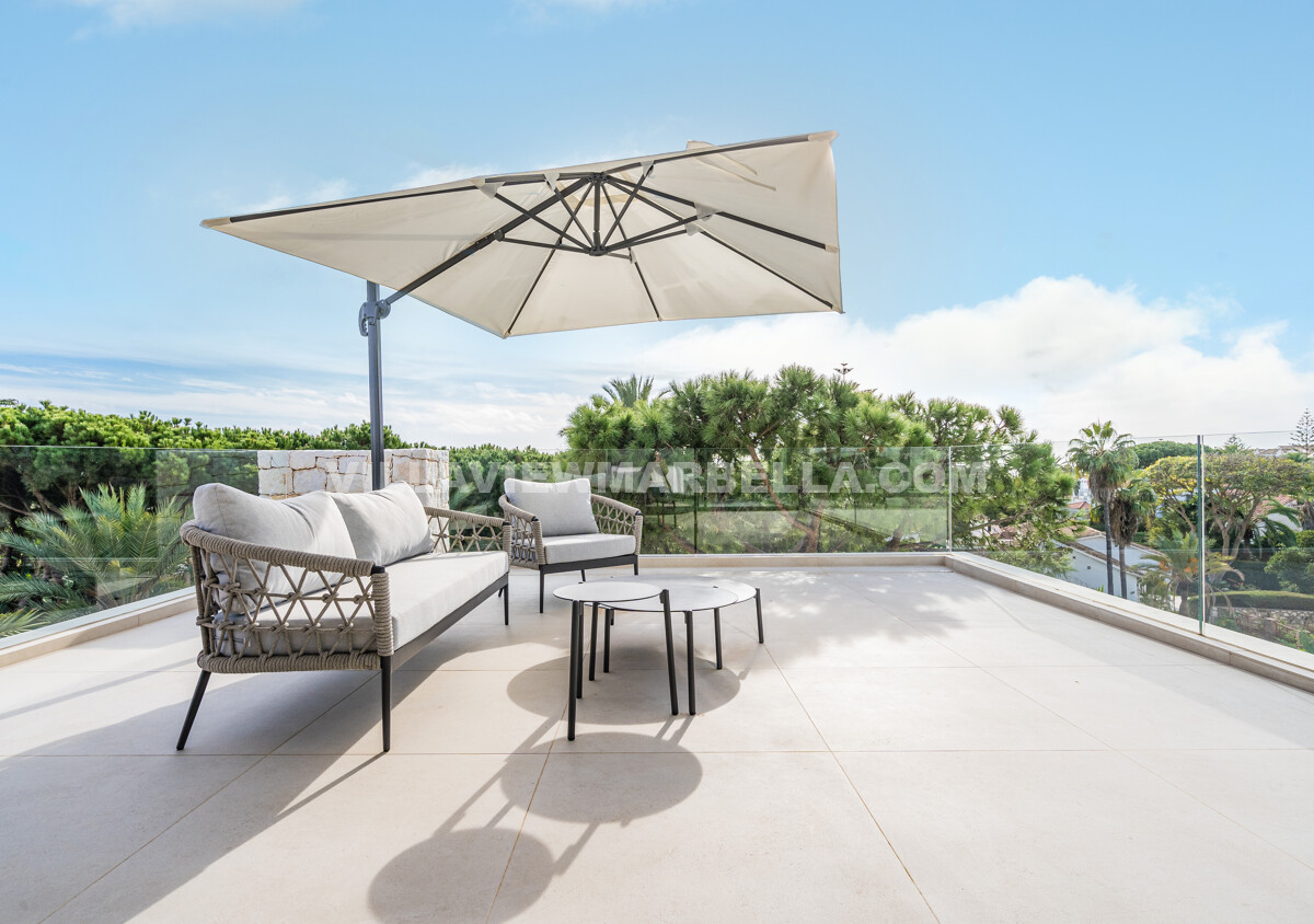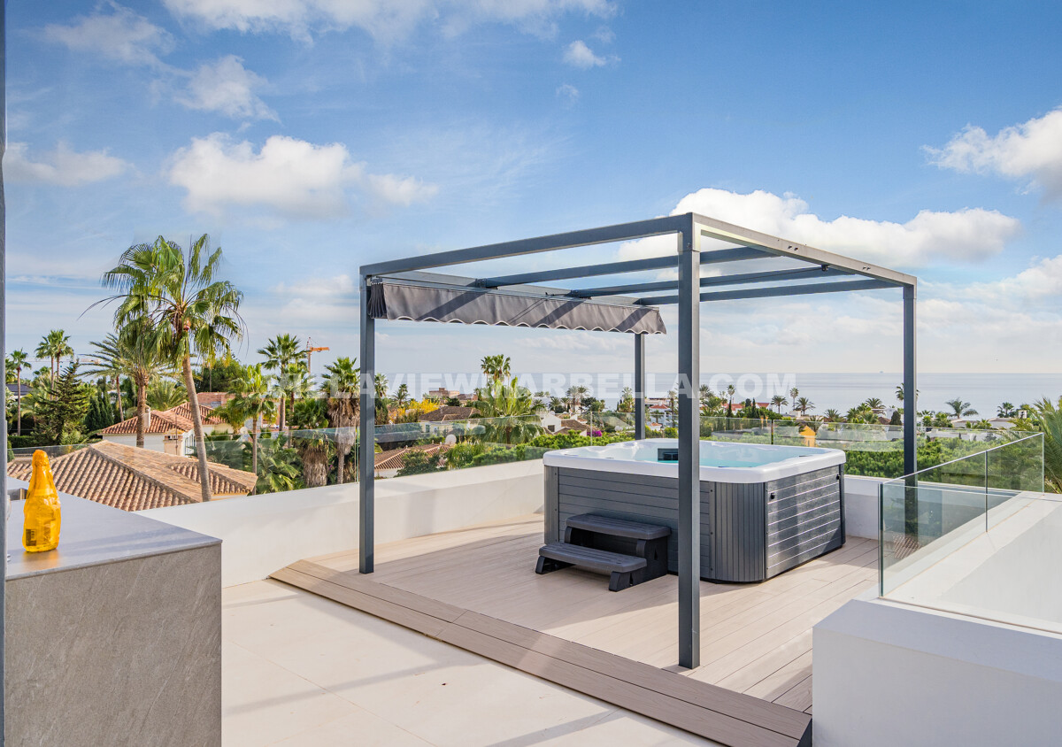 Upstairs, several bedroom suites open onto private terraces with pleasant views over the garden, surrounding greenery and towards the sea. The rooftop solarium provides panoramic coastal views and features a Jacuzzi, offering a relaxing space to enjoy the Marbella climate throughout the day.