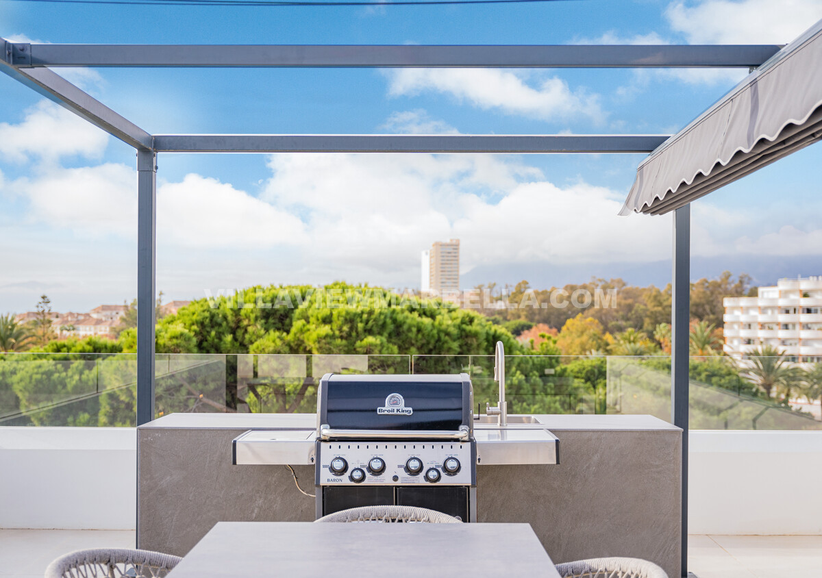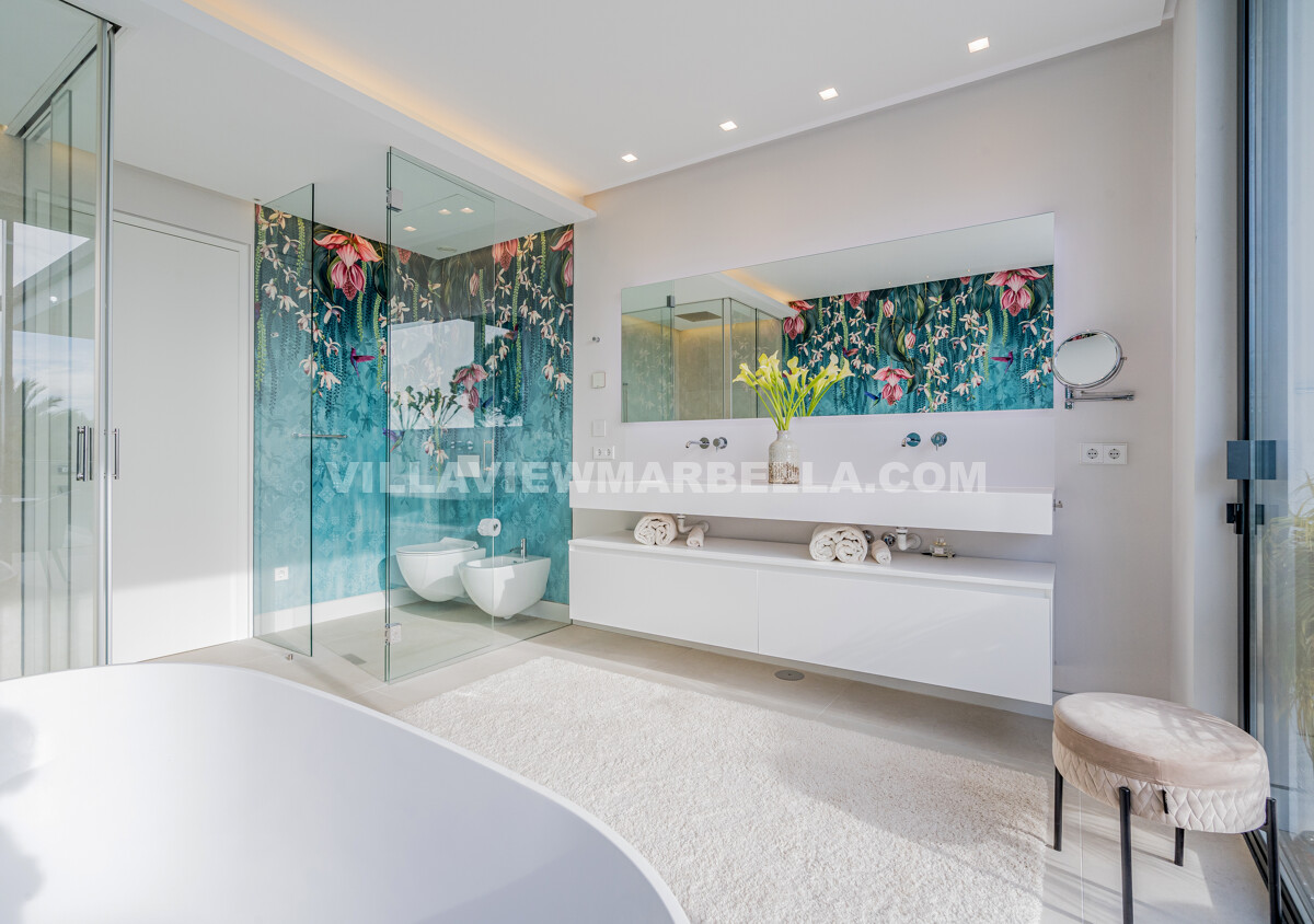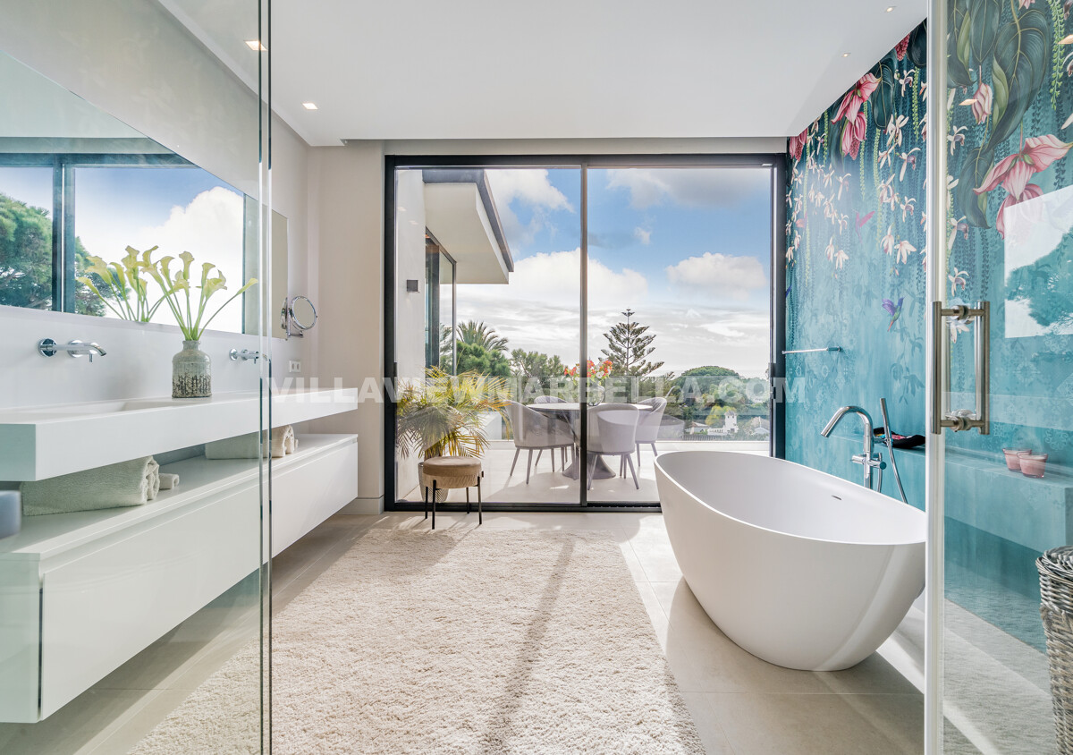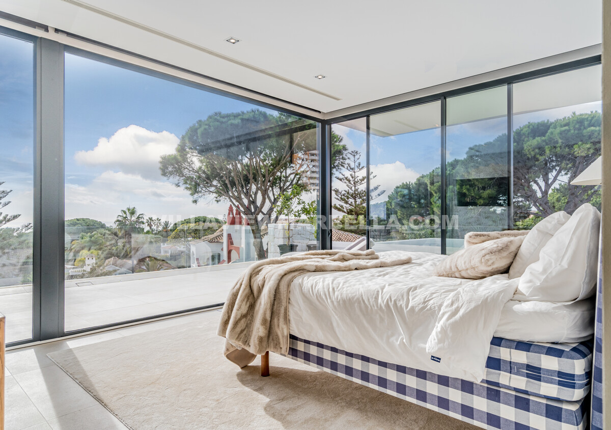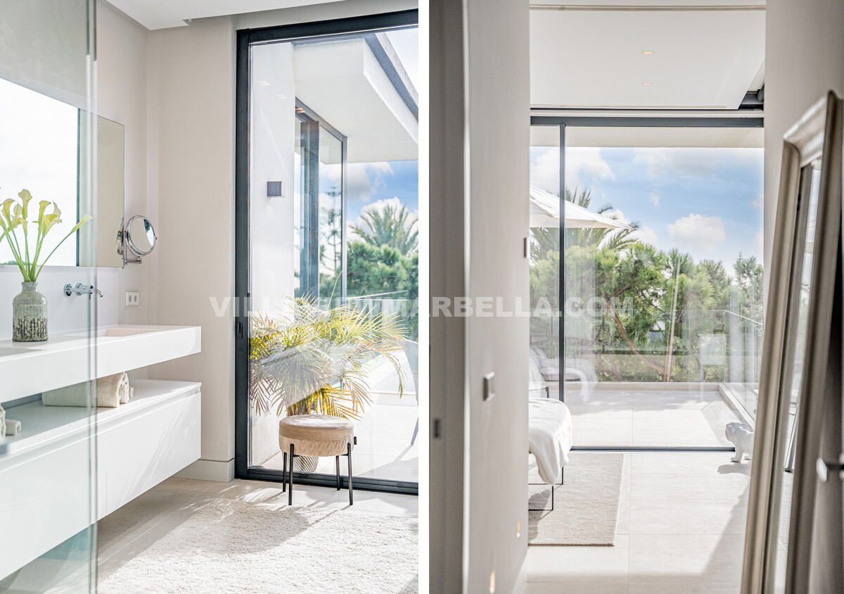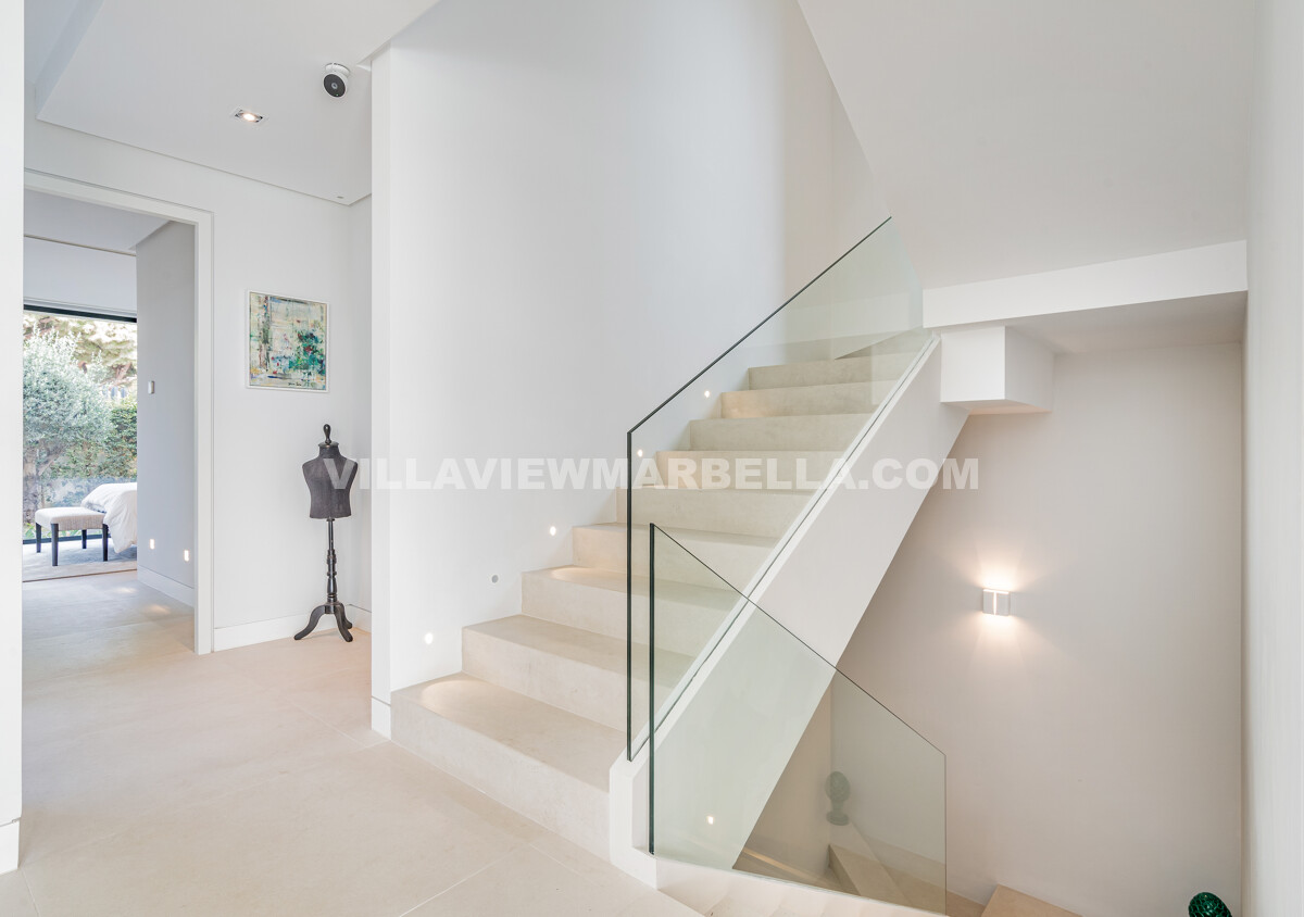 Upstairs, several bedroom suites open onto private terraces with pleasant views over the garden, surrounding greenery and towards the sea. The rooftop solarium provides panoramic coastal views and features a Jacuzzi, offering a relaxing space to enjoy the Marbella climate throughout the day.